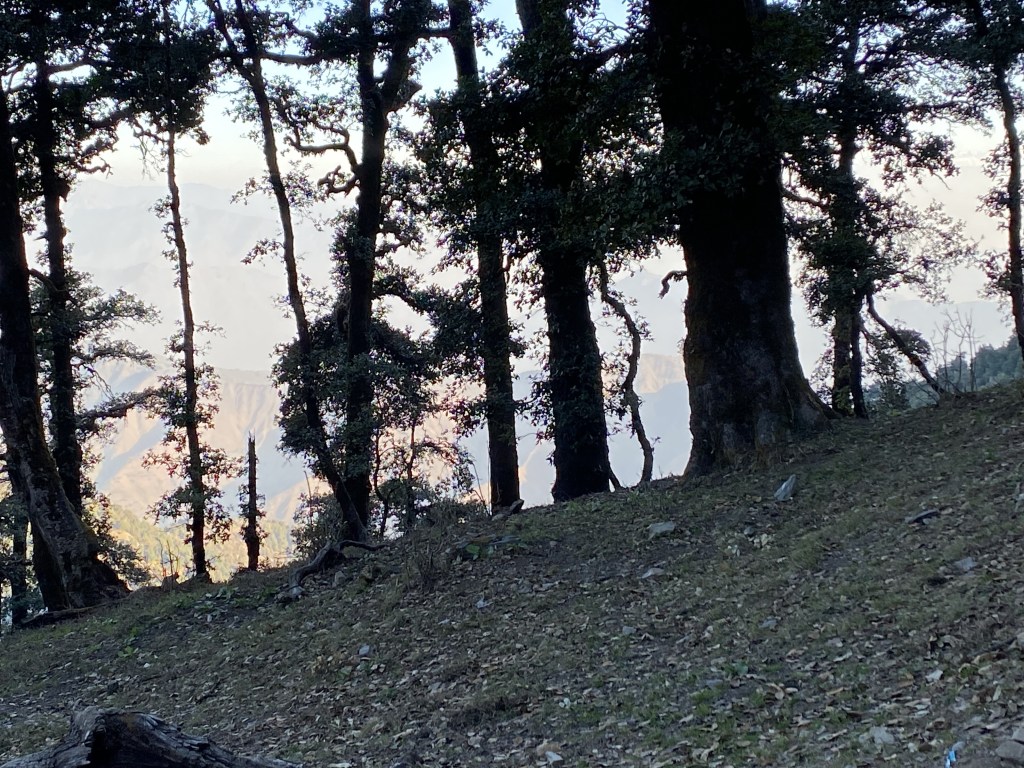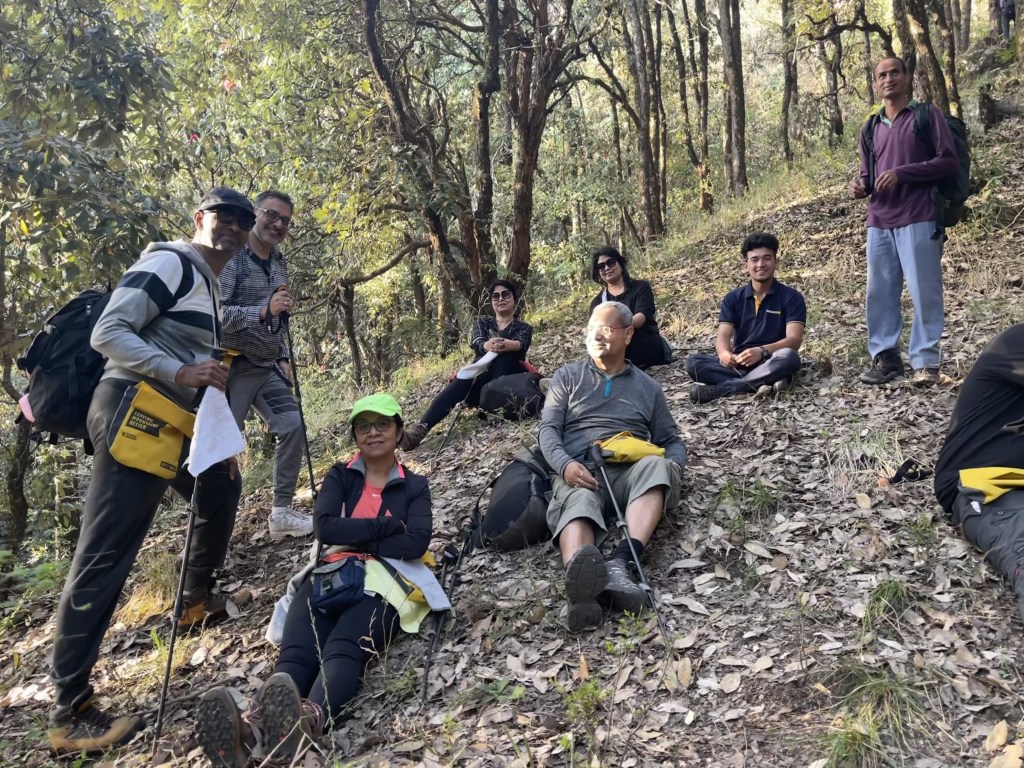 Now, the trail was beautiful and the climate was getting comfortable with gaining altitude and the softer sun in the afternoon/evening. Here, at times, I enjoyed the steepness partly because of foliage all over and partly for the satisfying experience of being able to climb a gradient of 50 degree at ease. Felt my basic mountaineering training came to some use!! We waited for the whole group to come together… but how far was the destination?? .no one knew. Two locals, who were part of the India Hikes team, had no clue of kilometre vs time..Cant really blame them as they were trying to match our pace. And they knew time required at their speed probably.