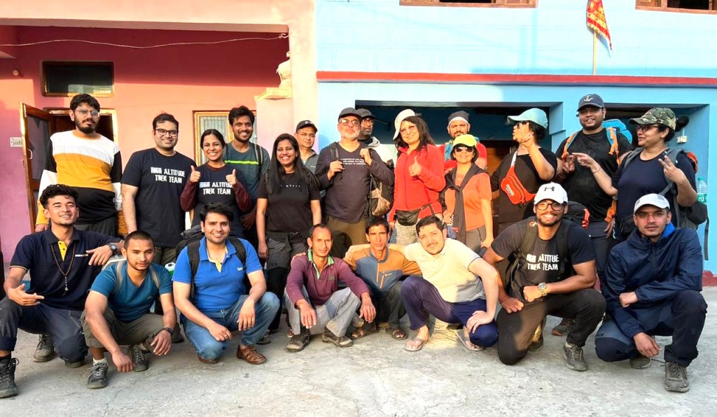 Myself, Saibal and Dadabhai sat for sometime and ate some nuts and oranges. Dawa, the guide started explaining how the fold mountain is formed. I was surprised seeing his passion and dedication for mountain rules and knowledge. Then it was the picture time with all the trekkers and flag…a moment will be cherished for rest of my life… fulfilling a dream kept under cover for 35 years..