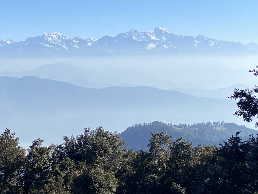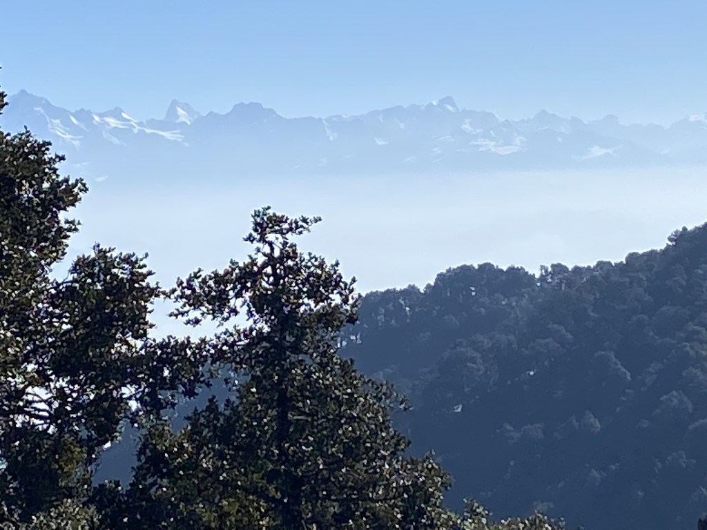 What a site..I tell you…All snow clad peaks around, more than 270 degree covered and the tree skeletons from forest fire spread less than a quadrant down the mountain range with Mussoorie city as the back.drop. It was mesmerising and spectacular. We were lucky to have clear blue sky, could see all peaks.