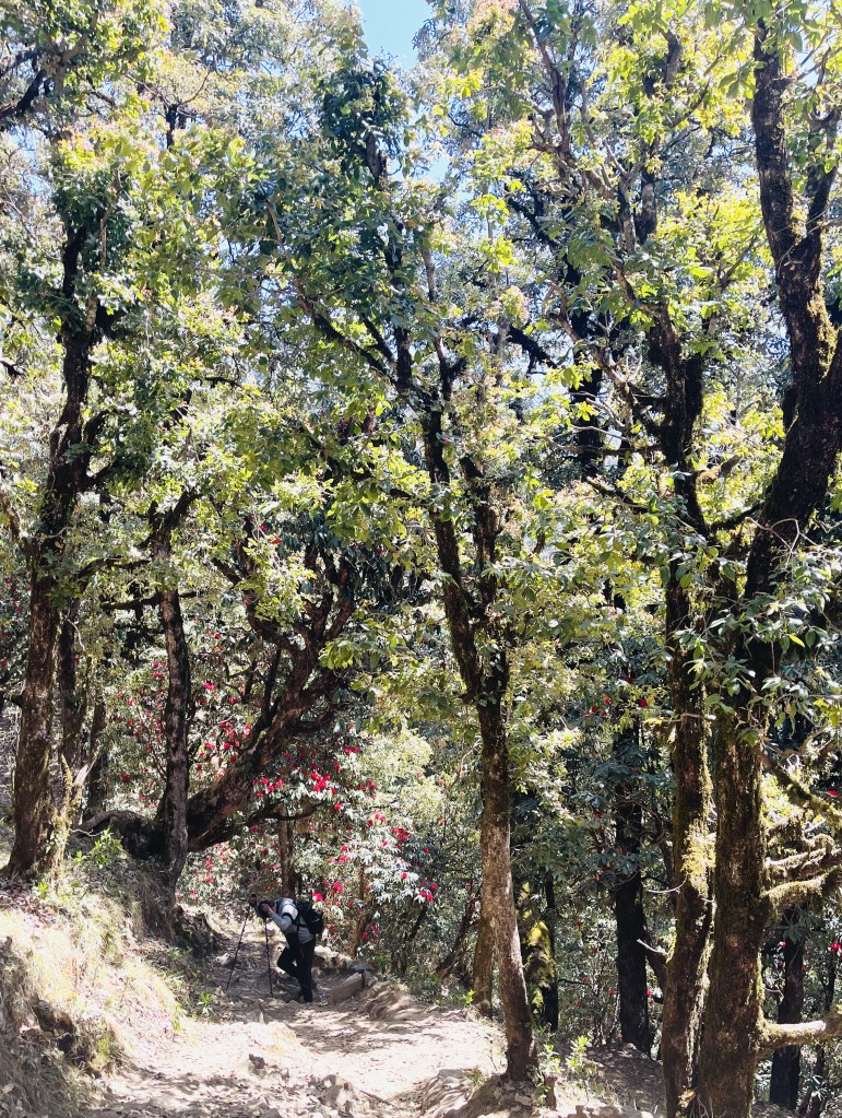 The barren path was rarely having vegetation initially and then we passed through patches of shrubs and bushes almost bruising us. Then the trail went through quite dense tropical kind of forest with red flashes of rhododendron which really lifted our perspiring spirit all the way distracting from the exertion. We were told that our lunch break was in a scenic village next to a stream. Yes, it was a beautiful spot and shaded as well. And the bonus was to see many different varieties of vegetation. We took around 20 minutes to have our packed lunch, wash and start again.